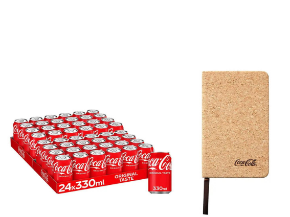 This bundle includes two packs of Coca-Cola Original Taste 24 x 330ml and a Coca-Cola A6 Cork Notebook