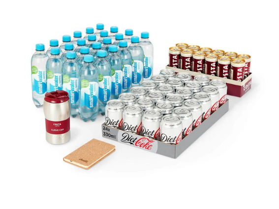 Includes Costa Coffee in a can, Diet Coke and Glaceau Smartwater. With great accessories too..